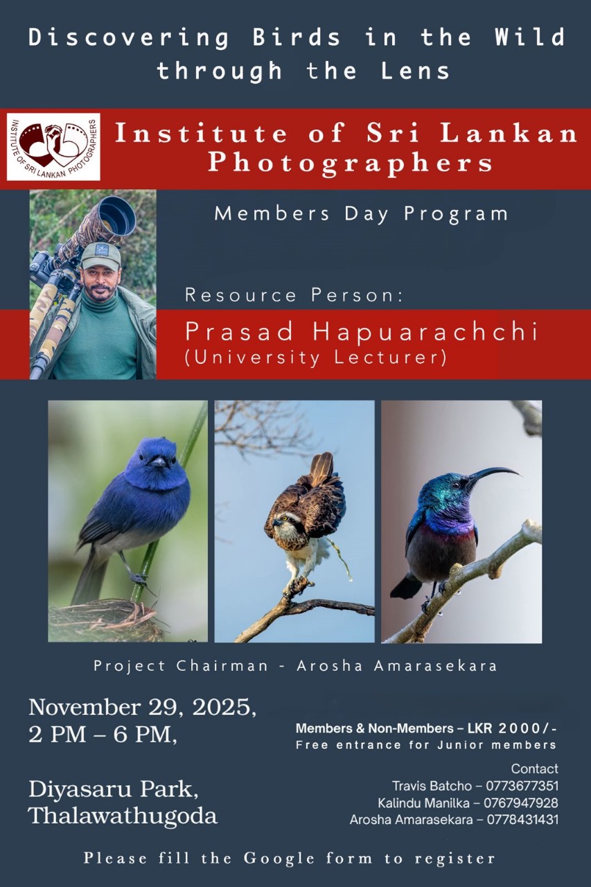Event Overview ශ්‍රී ලාංකීය ඡායාරූප ශිල්පීන්ගේ ආයතනයේ නොවැම්බර් මස සාමාජික වැඩමුළුව මෙම මස 29 සවස 2 සිට සවස 6 දක්වා තලවතුගොඩ දියසරැ උද්‍යානයේදී පැවැත්වීමට කටයුතු සූදානම්. මෙම වැඩමුළුව සඳහා සම්පත් […]