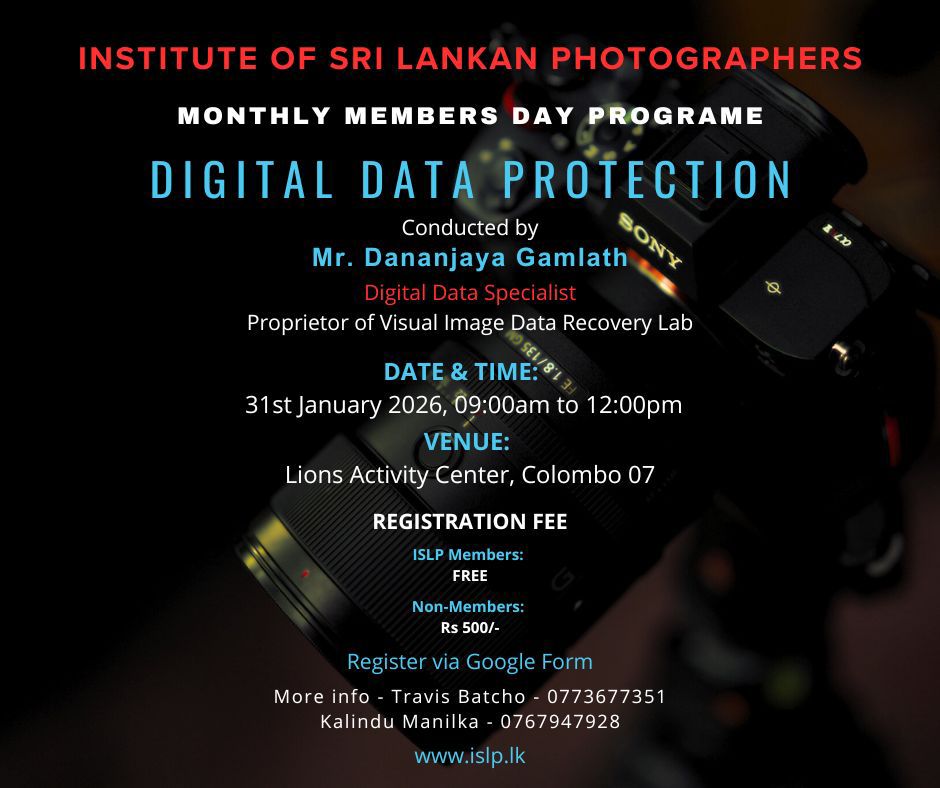 Event Overview ශ්‍රී ලාංකීය ඡායාරූප ශිල්පීන්ගේ ආයතනය මගින් සංවිධානය කරන මාසික සාමාජික වැඩමුළුව ජනවාරි මස 31 වෙනි දින පැවැත්වීමට සියලු කටයුතු සූදානම් කර ඇත එදින Digital Data Protection යන මාතෘකාව […]